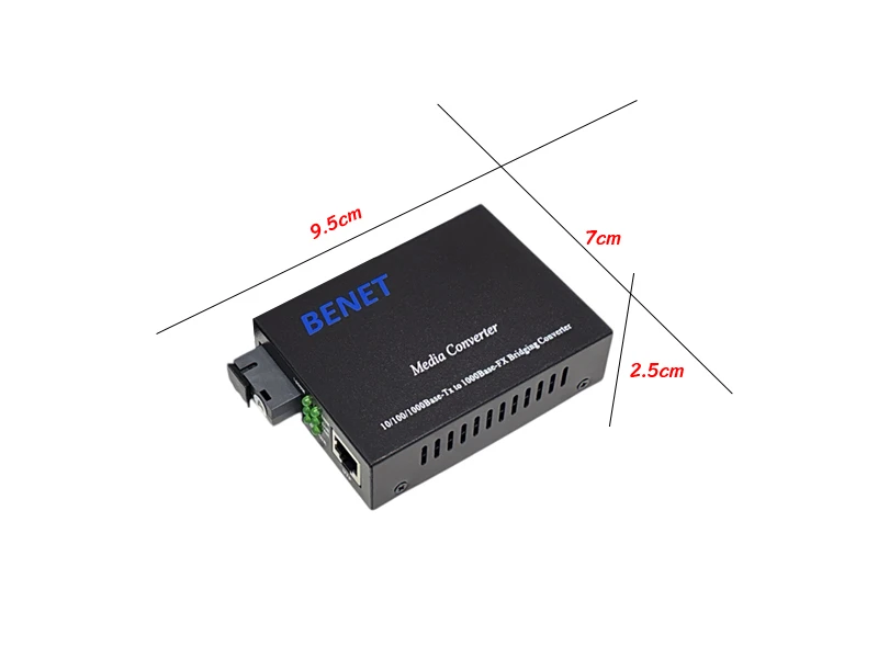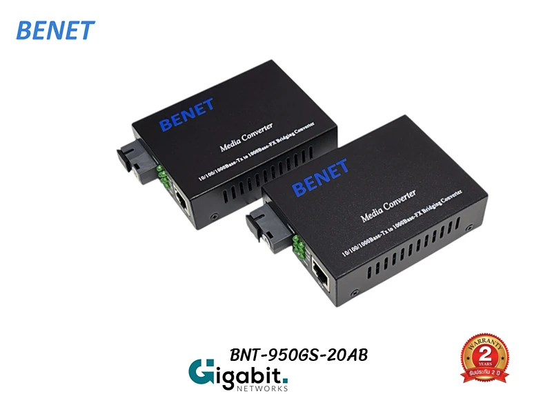 Gigabit Fiber Media Converter BIDI 1310/1550nm 20Km แบรนด์ BENET รุ่น BNT-950GS-20AB (R) ใช้แผงวงจรแบบเต็มไม่ลดอุปกรณ์ในวงจรลงเหมือนรุ่นทั่วไปที่ใช้แผงวงจรแบบครึ่งแผ่น ทำให้มีความเสถียรสูงกว่าและใช้ ชิพเซท Realtek สำหรับงานด้านเครือข่ายอินเตอร์เน็ต และงานด้านอื่นๆที่ใช้รูปแบบการเชื่อมต่อข้อมูลแบบ TCP รองรับการใช้งานร่วมกับสายไฟเบอร์ออฟติก 1 Core ชนิด Single Mode ในระยะ 0-20 กิโลเมตร