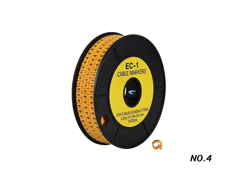 ปลอกมาร์คสายไฟ, สายแลน, สายโทรศัพท์ (Cable Marker เลข 4) รุ่น EC-1-4 คุณภาพสูง ผลิตจาก PVC เกรด A มีความยืดหยุ่นสูง ทนทานต่อความร้อน และการกัดกร่อน ช่วยให้การจัดระเบียบสายไฟในตู้คอนโทรลหรืองานติดตั้งระบบไฟฟ้าเป็นเรื่องง่ายและดูเป็นมืออาชีพ คุณสมบัติเด่น วัสดุ Flexible Soft PVC (เกรดไม่ลามไฟ) แบบวงกลม (Circle) ด้านในมีความยืดหยุ่น ยึดเกาะสายได้ดีไม่ลื่นตัวอักษรพิมพ์ด้วยหมึกคุณภาพสูง สีคมชัด ไม่หลุดลอกง่าย ช่วงขนาดสายที่รองรับเหมาะสำหรับสายไฟ, สายสัญญาณที่มี ขนาด 0.75 mm ถึง 3.5 mm เส้นผ่านศูนย์กลางภายในของ Marker ประมาณ 2.6mm ถึง 4.2mm บรรจุมั้วนละ 1,000 ชิ้น