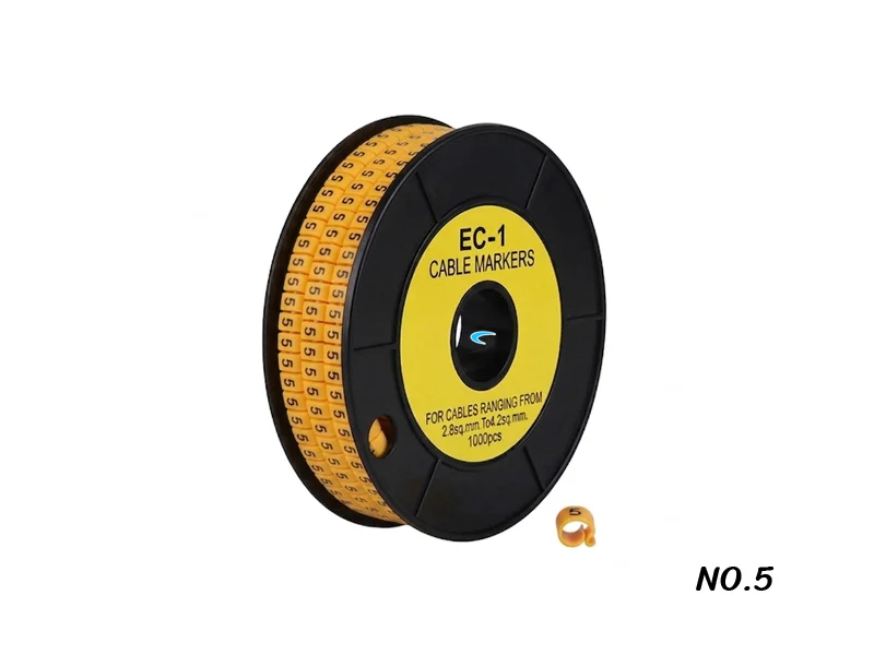 ปลอกมาร์คสายไฟ, สายแลน, สายโทรศัพท์ (Cable Marker เลข 5) รุ่น EC-1-5 คุณภาพสูง ผลิตจาก PVC เกรด A มีความยืดหยุ่นสูง ทนทานต่อความร้อน และการกัดกร่อน ช่วยให้การจัดระเบียบสายไฟในตู้คอนโทรลหรืองานติดตั้งระบบไฟฟ้าเป็นเรื่องง่ายและดูเป็นมืออาชีพ คุณสมบัติเด่น วัสดุ Flexible Soft PVC (เกรดไม่ลามไฟ) แบบวงกลม (Circle) ด้านในมีความยืดหยุ่น ยึดเกาะสายได้ดีไม่ลื่นตัวอักษรพิมพ์ด้วยหมึกคุณภาพสูง สีคมชัด ไม่หลุดลอกง่าย ช่วงขนาดสายที่รองรับเหมาะสำหรับสายไฟ, สายสัญญาณที่มี ขนาด 0.75 mm ถึง 3.5 mm เส้นผ่านศูนย์กลางภายในของ Marker ประมาณ 2.6mm ถึง 4.2mm บรรจุมั้วนละ 1,000 ชิ้น