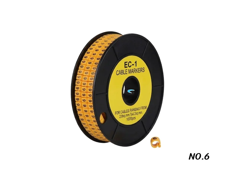 ปลอกมาร์คสายไฟ, สายแลน, สายโทรศัพท์ (Cable Marker เลข 6) รุ่น EC-1-6 คุณภาพสูง ผลิตจาก PVC เกรด A มีความยืดหยุ่นสูง ทนทานต่อความร้อน และการกัดกร่อน ช่วยให้การจัดระเบียบสายไฟในตู้คอนโทรลหรืองานติดตั้งระบบไฟฟ้าเป็นเรื่องง่ายและดูเป็นมืออาชีพ คุณสมบัติเด่น วัสดุ Flexible Soft PVC (เกรดไม่ลามไฟ) แบบวงกลม (Circle) ด้านในมีความยืดหยุ่น ยึดเกาะสายได้ดีไม่ลื่นตัวอักษรพิมพ์ด้วยหมึกคุณภาพสูง สีคมชัด ไม่หลุดลอกง่าย ช่วงขนาดสายที่รองรับเหมาะสำหรับสายไฟ, สายสัญญาณที่มี ขนาด 0.75 mm ถึง 3.5 mm เส้นผ่านศูนย์กลางภายในของ Marker ประมาณ 2.6mm ถึง 4.2mm บรรจุมั้วนละ 1,000 ชิ้น