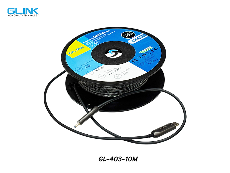 สาย HDMI Fiber Optic แบรนด์ GLINK รุ่น GL-403-10 ความยาว 10 เมตร คือสาย HDMI ที่ใช้สัญญาณแสงเป็นตัวนำ หรือสายไฟเบอร์ออฟติกซึ่งข้อดีของสายชนิดนี้จะมีค่าการสูญเสียสัญญาณต่ำมาก เพราะใช้แสงเป็นตัวนำและสามารถเชื่อมต่อสัญญาณจากอุปกรณ์ถึงจอแสดงผลได้ไกลกว่าสายแบบทองแดงทั่วไป การใช้งานของสายประเภทนี้ต้องเสียบให้ถูกฝั่งเท่านั้นถึงจะใช้งานได้ โดยที่หัวสายจะระบุฝั่งให้ชัดเจนโดยฝั่งอุปกรณ์ต้นทางจะระบุข้อความ Source และปลายทางจะระบุข้อความ Display เป็นตัวหนังสือใว้ให้ เนื่องจากภายในหัวสายจะมีโมดูลแสงฝังไว้ ตัวสายรองสัญญาณ 4K@60Hz 4:4:4 เต็มรูปแบบ
