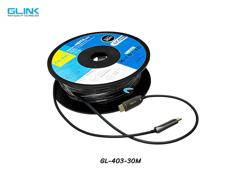 สาย HDMI Fiber Optic แบรนด์ GLINK รุ่น GL-403-30 ความยาว 30 เมตร คือสาย HDMI ที่ใช้สัญญาณแสงเป็นตัวนำ หรือสายไฟเบอร์ออฟติกซึ่งข้อดีของสายชนิดนี้จะมีค่าการสูญเสียสัญญาณต่ำมาก เพราะใช้แสงเป็นตัวนำและสามารถเชื่อมต่อสัญญาณจากอุปกรณ์ถึงจอแสดงผลได้ไกลกว่าสายแบบทองแดงทั่วไป การใช้งานของสายประเภทนี้ต้องเสียบให้ถูกฝั่งเท่านั้นถึงจะใช้งานได้ โดยที่หัวสายจะระบุฝั่งให้ชัดเจนโดยฝั่งอุปกรณ์ต้นทางจะระบุข้อความ Source และปลายทางจะระบุข้อความ Display เป็นตัวหนังสือใว้ให้ เนื่องจากภายในหัวสายจะมีโมดูลแสงฝังไว้ ตัวสายรองสัญญาณ 4K@60Hz 4:4:4 เต็มรูปแบบ