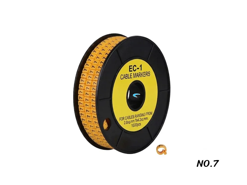 ปลอกมาร์คสายไฟ, สายแลน, สายโทรศัพท์ (Cable Marker เลข 7) รุ่น EC-1-7 คุณภาพสูง ผลิตจาก PVC เกรด A มีความยืดหยุ่นสูง ทนทานต่อความร้อน และการกัดกร่อน ช่วยให้การจัดระเบียบสายไฟในตู้คอนโทรลหรืองานติดตั้งระบบไฟฟ้าเป็นเรื่องง่ายและดูเป็นมืออาชีพ คุณสมบัติเด่น วัสดุ Flexible Soft PVC (เกรดไม่ลามไฟ) แบบวงกลม (Circle) ด้านในมีความยืดหยุ่น ยึดเกาะสายได้ดีไม่ลื่นตัวอักษรพิมพ์ด้วยหมึกคุณภาพสูง สีคมชัด ไม่หลุดลอกง่าย ช่วงขนาดสายที่รองรับเหมาะสำหรับสายไฟ, สายสัญญาณที่มี ขนาด 0.75 mm ถึง 3.5 mm เส้นผ่านศูนย์กลางภายในของ Marker ประมาณ 2.6mm ถึง 4.2mm บรรจุมั้วนละ 1,000 ชิ้น