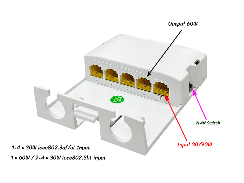 อุปกรณ์รุ่นนี้สามารถจ่ายกำลังไฟได้ 60W ที่พอร์ต 1 แต่มีเงื่นไขที่ว่ากำลังไฟขาเข้าต้องเป็น POE++ หรือ POE มาตรฐาน ieee802.3bt ที่มีกำลังไฟ 90-100W เท่านั้น เหมาะสำหรับอุปกรณ์ที่ใช้ไฟสูง เช่น PTZ camera, LED lighting, access point ระดับสูง และ mini-PC บางรุ่น