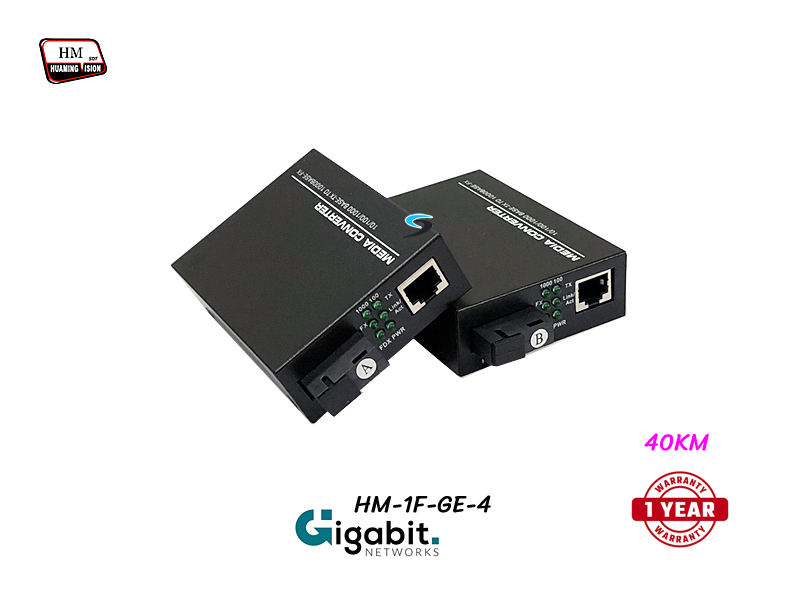 Gigabit Fiber Media Converter BIDI 40KM แบรนด์ HM รุ่น HM-1F-GE-4 สำหรับงานด้าน (Network) อินเตอร์เน็ต, (cctv) IP-Camera และงานด้านอื่นๆที่ใช้รูปแบบการเชื่อมต่อข้อมูลแบบ TCP/IP ด้วยความเร็ว 10/100/1000 Mbps รองรับการใช้งานร่วมกับสายไฟเบอร์ออฟติก 1 Core ชนิด Single Mode ในระยะไม่เกิน 40 กิโลเมตร อุปกรณ์ใช้ PCB แบบ HALF Bord เหมือนแบรนด์ทั่วๆไป และใช้โมดูลแสงแบบ (SC) 6X9 รับส่งแสงความยาวคลื่น (A)1310nm และ (B)1550nm สลับกัน (BIDI, WDM] อุปกรณ์ชุดนี้รุ่นนี้เหมาะกับการเชื่อมโยงลิ้งไฟเบอร์ออฟติกระยะไกล เพื่อทดแทนระยะจำกัดของสายแลนที่สามารถส่งข้อมูลได้เพียง 100 เมตร