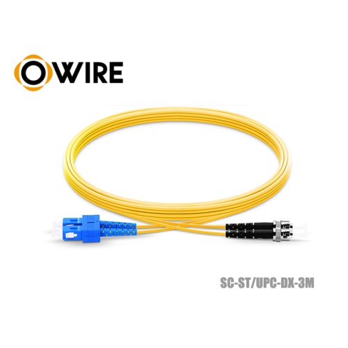 Patch Cord SC-ST (UPC) Single-mode Duplex ยาว 3 เมตร ยี่ห้อ OWIRE สายประเภทนี้จะเหมาะกับการนำมาเป็นสายต่อเข้าอุปกรณ์ต่างๆ ที่รองรับแบบ Duplex หรือสายคู่ เนื่องจากจะเป็นสายอ่อนให้ตัวได้ง่าย โค้งงอได้ดี เราจะเห็นสายลักษณะนี้มากสุดตามตู้แร็คเครื่องเซิฟเวอร์ต่างๆที่ใช้ระบบไฟเบอร์ออฟติกเป็นสายโอนถ่าย เชื่อมต่อข้อมูล เอกลักเด่นส่วนใหญ่ของสายจะเป็นสีเหลือง ในกรณีที่เป็นชนิด Single Mode