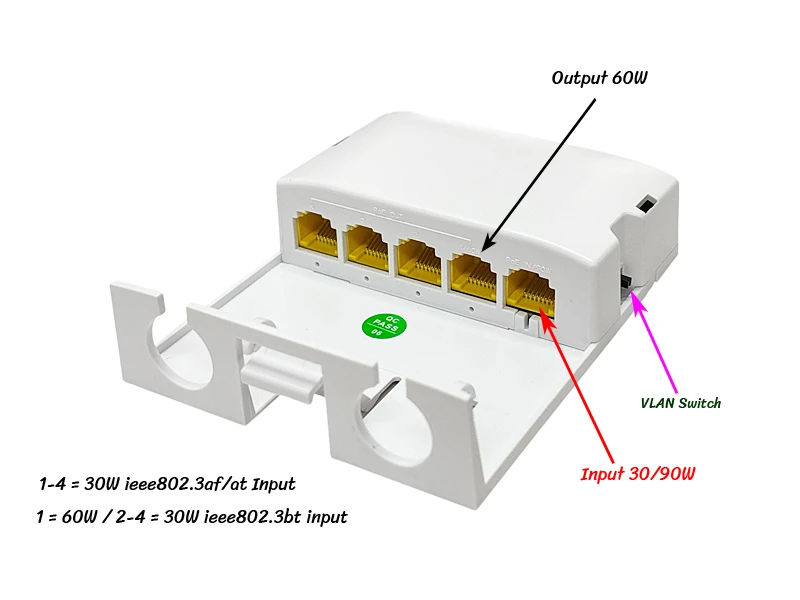 | POE Power | The whole power is 90W, the first output port has a maximum output power of 60W and the 2nd-4th output ports have a maximum output power of 30W |