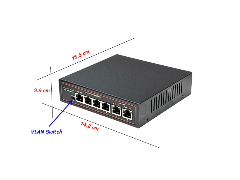 Gigabit Poe Switch 4 Port 48V มาตรฐาน ieee802.3af/at เป็นอุปกรณ์จ่ายไฟและส่งข้อมูลไปในสายแลนเส้นเดียวพร้อมกัน รองรับการใช้งานร่วมกับกล้องวงจรปิดแบบ IP-Camera ทุกยี่ห้อ รวมถึง Access Point และอุปกรณ์อื่นๆ ที่รองรับ POE ในตัว ระยะในการจ่ายไฟผ่านสายแลน + Data ที่ระยะ 100 เมตร โดยสายแลนแบบ Cat5E, Cat6 พิเศษ รุ่นนี้รองรับการใช้งาน Vlan Dip Switch โดยลักษณะการทำงานจะเป็น Isolate port แต่ละ Port ไม่ให้มองเห็นกัน ช่วยเรื่องการฟุ้งกระจายของ Data ได้ดีเยี่ยม